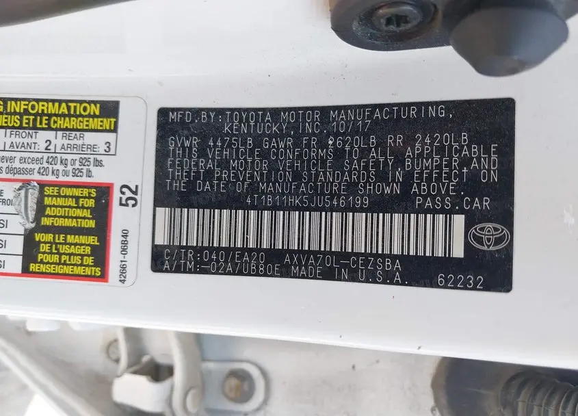 Each lot presented on our website includes comprehensive information tied to the VIN code. This allows users to cross-check vehicle data, verify the history of ownership, and confirm accident or insurance records. The Toyota Camry 2018 White corresponds to a car that was listed through one of the large insurance auctions in USA, which guarantees traceability and transparency of the information.
