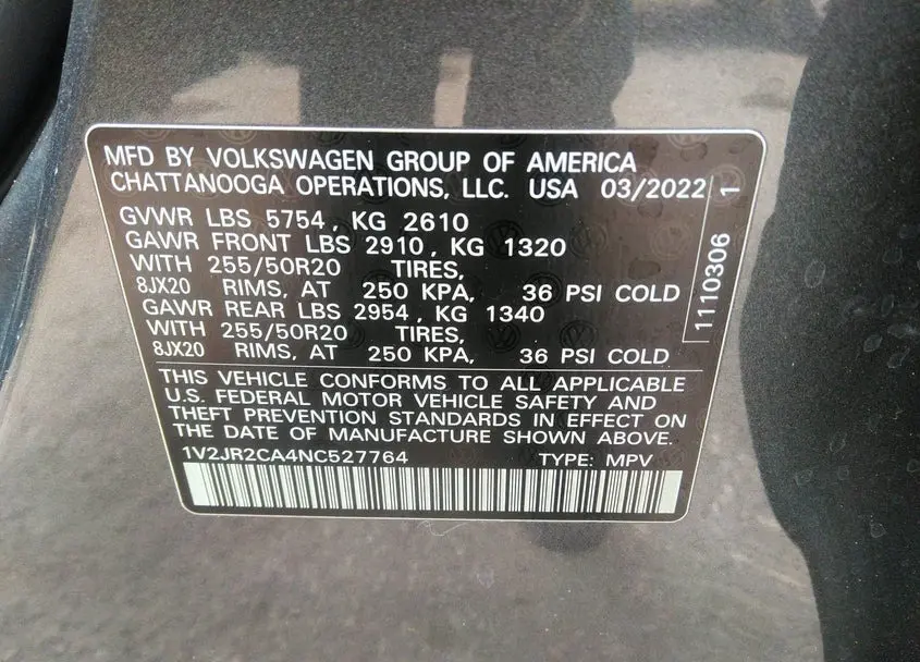 The Volkswagen Atlas 2022 Grey is equipped with a 3.6L VR6 DOHC 24-VALVE -INC engine. This power unit is known for its efficiency and reliability, and it is part of modern generation of engines designed to balance performance with fuel economy. According to the auction data, the vehicle was registered with only 5500 of mileage at the time of sale.